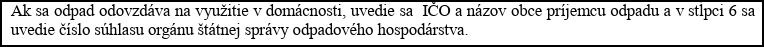 Ak ide o odpad vhodný na využitie v domácnosti, je možné odovzdať ho zamestnancom, avšak len v prípade, že na to bol vydaný príslušným okresným úradom súhlas podľa § 97 ods. 1 písm. n). Číslo tohto súhlasu sa následne uvádza do poznámky (stĺpec č. 6).