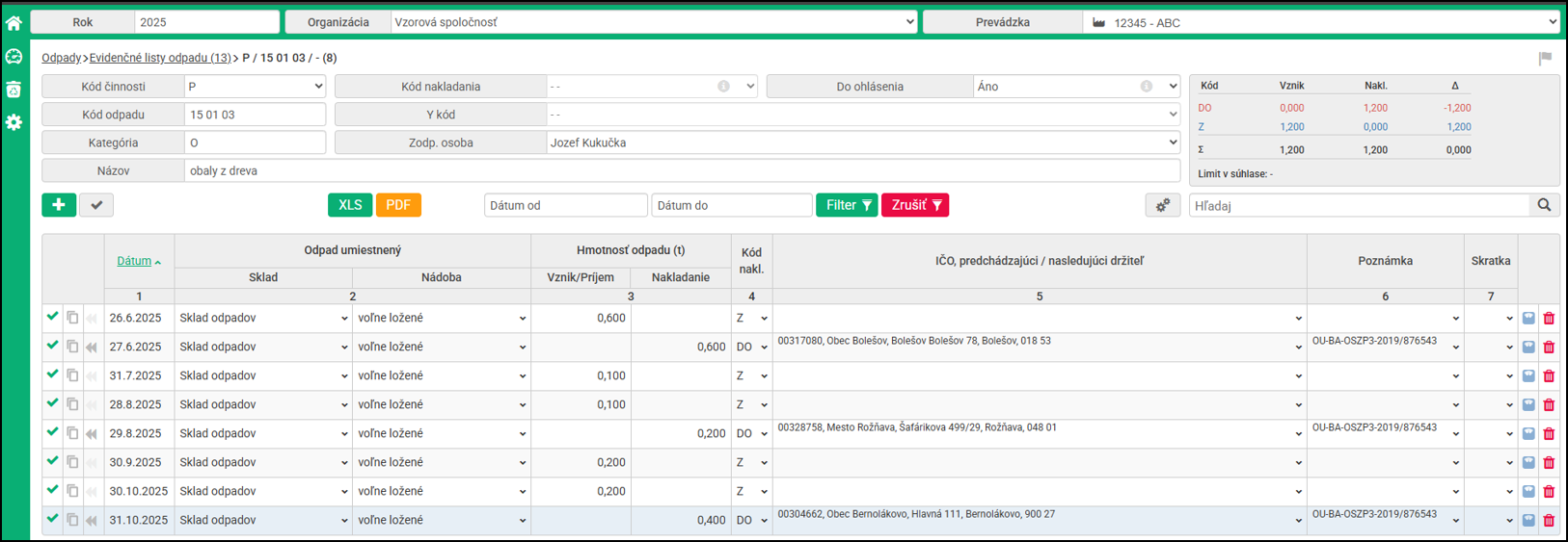 Záznam v evidenčnom liste odpadu pri odovzdaní odpadu vhodného na využitie v domácnosti (odovzdaného zamestnancovi):